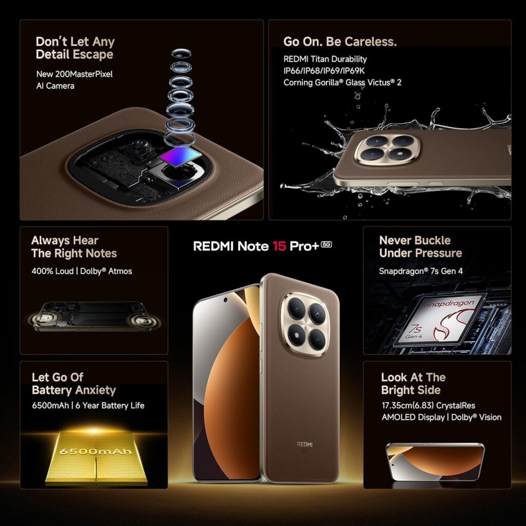 1. Redmi A4 5G ⭐⭐⭐✨ (3.9/5) Operating SystemAndroid 14CPU ModelQualcomm Snapdragon 4s Gen 2Processor Speed2 GHzDisplay6.88 inchesResolution720 * 1640RAM / Storage[4GB+64GB] / [4GB+128GB] / [6GB+128GB]Camera 50MP Rear, 5MP FrontMicroSD Slot1 TBBattery5160mAhRefresh Rate120 HzPixel Density260 PPIColourSparkle Purple / Starry Black Check Price on Amazon 2. REDMI Note 15 Pro+ ⭐⭐⭐⭐✨ (4.2/5) Operating System Android 15, Xiaomi HyperOS CPU Model Snapdragon 7s Gen 4 Processor Speed 2.7 Ghz Display AMOLED Resolution 2772 * 1280 RAM / Storage [8GB+256GB] / [12GB+256GB] / [12GB+512GB] Camera 200MP, 32MP MicroSD Slot – Battery 6500mAh Refresh Rate 120Hz Pixel Density 447 PPI Colour Coffee Mocha / Carbon Black / Mirage Blue Check Price on Amazon 3. REDMI 15C ⭐⭐⭐⭐✨ (4.1/5) Operating SystemAndroid 15, Xiaomi HyperOSCPU ModelMediatek Dimensity 6300Processor Speed2.4 GHzDisplay6.9 InchesResolution720 * 1560RAM / Storage[4GB+128GB] / [6GB+128GB] / [4GB+128GB]Camera 50 MPMicroSD Slot1 TBBattery6000mAhRefresh Rate120Pixel Density260 PPIColourMoonlight Blue, Dusk Purple, Midnight Black Check Price on Amazon 4. Redmi Note 14 SE ⭐⭐⭐✨ (3.9/5) Operating SystemANDROID 15CPU ModelMediaTek Dimensity 7025-UltraProcessor Speed2 GHzDisplay6.67 inchesResolution1080 * 2340RAM / Storage[6GB/128GB]Camera 50 MP, 20 MPMicroSD Slot1 TBBattery5110mAhRefresh Rate120 HzPixel Density395 PPIColourCrimson ArtVideo Resolution1080 PixelsFrame Rate30Weight230 GramsDimensions15 x 10 x 6 CentimetersWireless TechBluetooth, GSM, LTE, Wi-F Check Price on Amazon 5. REDMI 15 ⭐⭐⭐⭐ (4.0/5) Operating SystemAndroid 15, Xiaomi HyperOSCPU ModelQualcomm Snapdragon 6s Gen 3Processor Speed2.23 GHzDisplay6.9 inchesResolution1080 * 2340RAM / Storage[6GB+128GB] / [8GB+128GB] / [8GB+256GB]Camera 50 MP, 8 MPMicroSD Slot2 TBBattery7000mAhRefresh Rate144 HzPixel Density374 PPIColourFrosted White, Midnight Black, Sandy Purple Check Price on Amazon 6. REDMI Note 15 ⭐⭐⭐⭐✨ (4.1/5) Operating System Android 15, Xiaomi HyperOS CPU Model Qualcomm Snapdragon 6 Gen 3 Processor Speed 2.4 Ghz Display 17.2 Centimeters Resolution 1920 * 1080 RAM / Storage [8GB+128GB] / [8GB+256GB] Camera 108 Mp MicroSD Slot 2 TB Battery 5520mAh Refresh Rate 120 Hz Pixel Density 388 PPI Colour Black, Glacier Blue, Mist Purple Check Price on Amazon 7. Redmi 15 Pro ⭐⭐⭐⭐✨ (4.2/5) Operating System Android 15, Xiaomi HyperOS CPU Model MediaTek Dimensity 7400-Ultra Processor Speed 2.7 Ghz Display AMOLED Resolution 2772 * 1280 RAM / Storage [8GB+128GB] / [8GB+256GB] Camera 200MP Battery 6580mAh Refresh Rate 120Hz Pixel Density 447 PPI Colour Mirage Blue, Carbon Black, Silver Ash Check Price on Amazon 8. REDMI Note 15, Mist Purple ⭐⭐⭐⭐✨ (4.1/5) Operating SystemAndroid 15, Xiaomi HyperOSCPU ModelQualcomm Snapdragon 6 Gen 3Processor Speed2.4 GhzDisplay17.2 CentimetersResolution1920 * 1080RAM / Storage[8GB+128GB] / [8GB+256GB]Camera 108 MpMicroSD Slot2 TBBattery5520mAhRefresh Rate120 HzPixel Density388 PPIColourMist Purple Check Price on Amazon